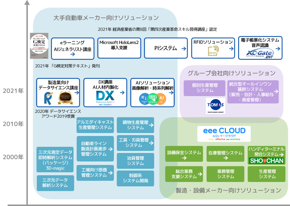 - ■大手自動車メーカー向けソリューション - 1986年~ - 三次元データ解析システム(1986-2016) - 工場向け原価管理システム(1988-1992)>> - 自動車ライン製造計画進捗管理システム(1993-)>> - 制御系システム開発(1989-1995) - 治具管理システム(1998-) - 工具・刃具管理システム(1998-)>> - 2000年~ - 三次元計測データ 即時解析システム(パッケージ)3D-magic(2000-2016) - アルミダイキャスト生産管理システム(2002-) - 鋳物生産管理システム(2002-)>> - 2010年~ - PIシステム導入支援(2019-)>> - 2020年~ - 製造業特化型データサイエンス講座(2019-)>> - DX講座(2020-)>> - AI開発支援(2020-)>> - XC-GATE導入支援(2020-)>> - RFIDソリューション(2020-)>> - AI短期講座(2021-)>> - e-ラーニング経営者・MG向けAI講座(2021-)>> - Microsoft HoloLens 2導入支援(2021-)>> - ■製造・設備メーカー向けソリューション - 2000年~ - 総合業務支援システム(2004-)>> - 業務管理システム(2004-) - 生産管理システム(2005-) - 設備保全システム(パッケージ)(2005-)>> - 在庫管理システム(パッケージ)(2005-)>> - 2010年~ - ハンディターミナル照合システム(パッケージ)(2019-)>> - ■グループ会社向けソリューション - 2000年~ - 個別生産管理システム(2008-) - 統合型オールインワン基幹システム(販売・関係・人事給与・資産管理)(2008-)>>