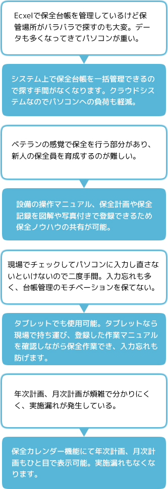 履歴照会として過去の類似保全実績を参照する事ができますので過去トラブルから類似修理等の内容を把握する事ができます。